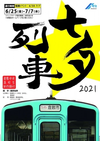 倉敷中央高校生が、ヘッドマーク題字と車内の七夕列車の飾り付けを制作してくれました。