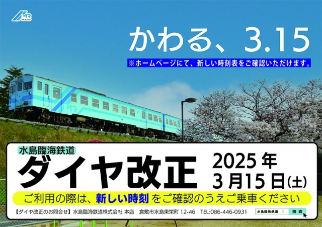 水島臨海鉄道では、利便性の向上のため2025年3月15日(土)にダイヤ改正を実施いたします。